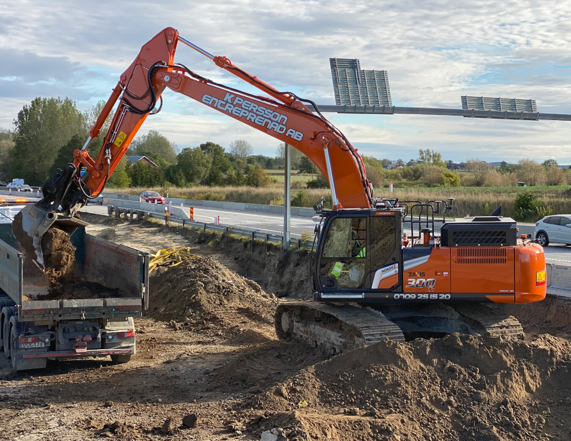 Just nu jobbar Kristoffer med urgrävningar och vägarbeten på E22. När han jämför sina två maskiner i samma typ av jobb känns Hitachin mer följsam. Och när det handlar om mer detaljerat arbete, som till exempel att gräva slänter, är ZX300LC-7 betydligt lättare att arbeta med.