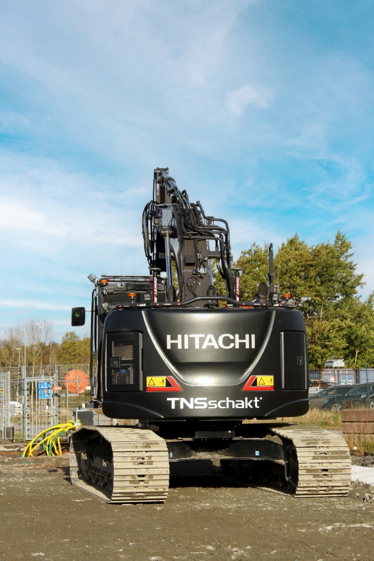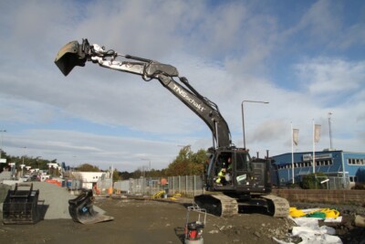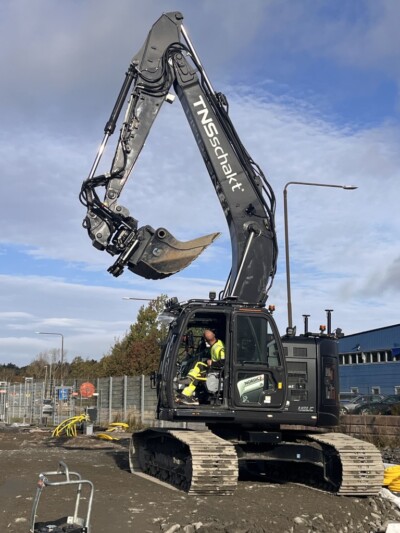 Den sticker ut på bygget i Torslanda. En Hitachi ZX225USLC-7 – helfolierad i svart med vita logotyper.